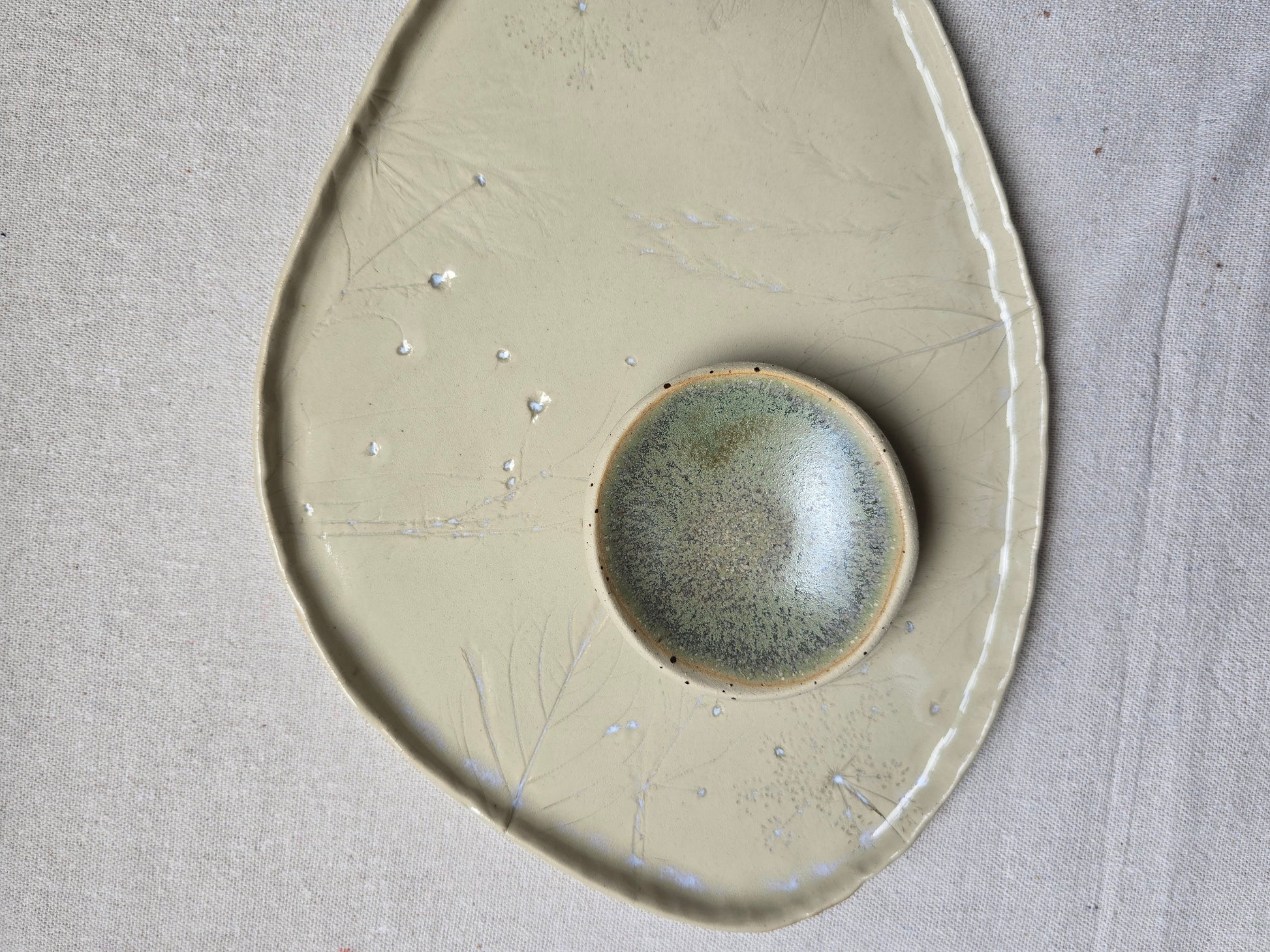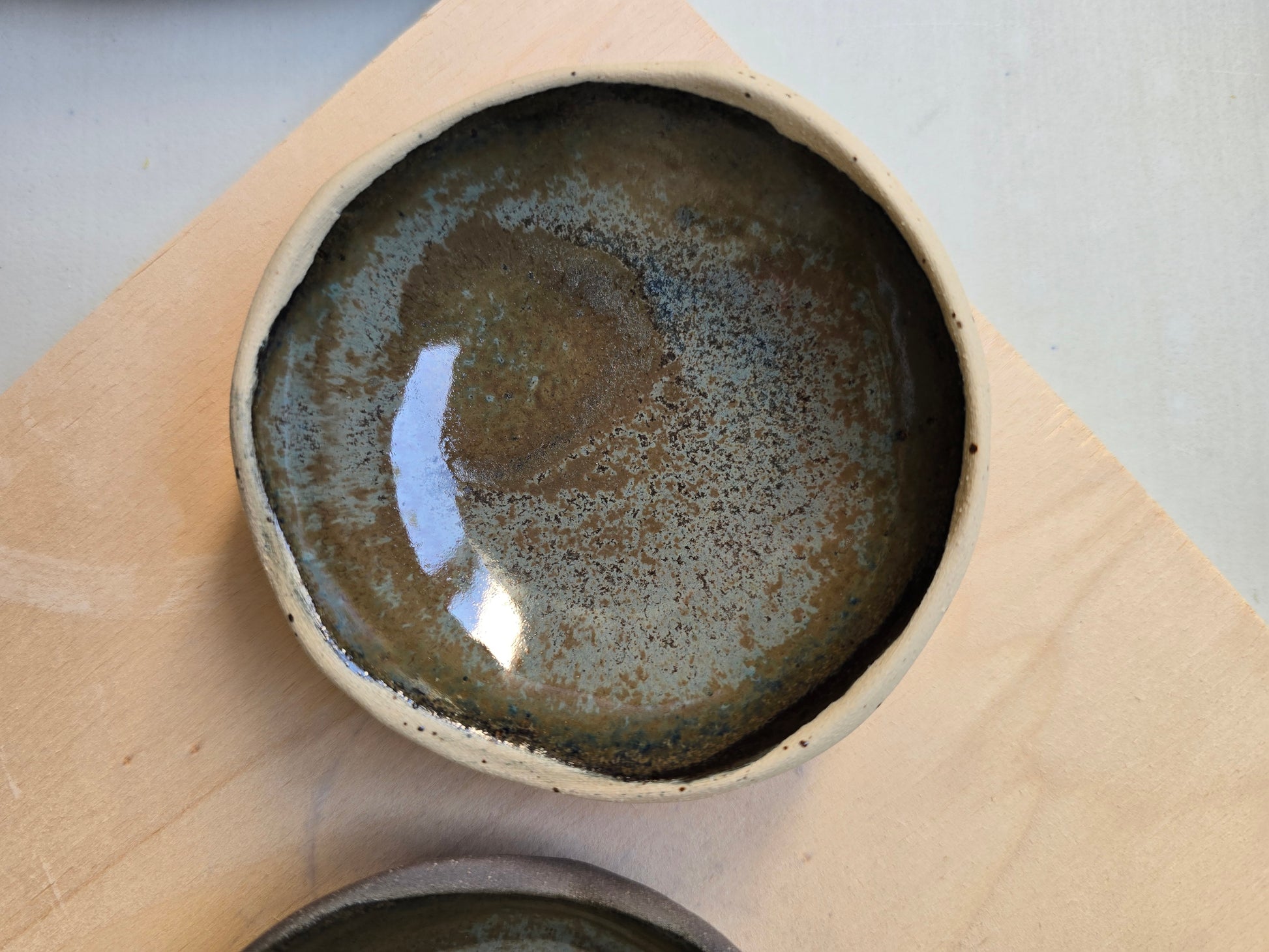 SCRIGNO Ciotolina porta soia o porta gioiellini , forma concava e tonda in gres crema puntinato, smaltata dentro .