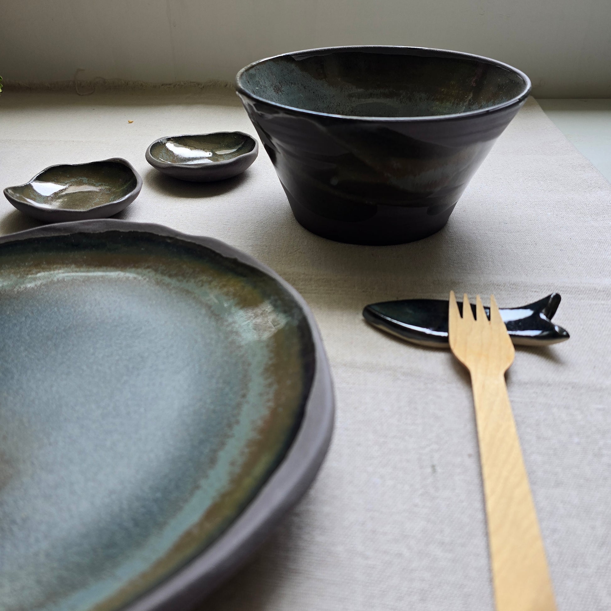 PRE ORDER Piatto “Luna di Terra” – gres nero fatto a mano forma organica smaltato in vari colori