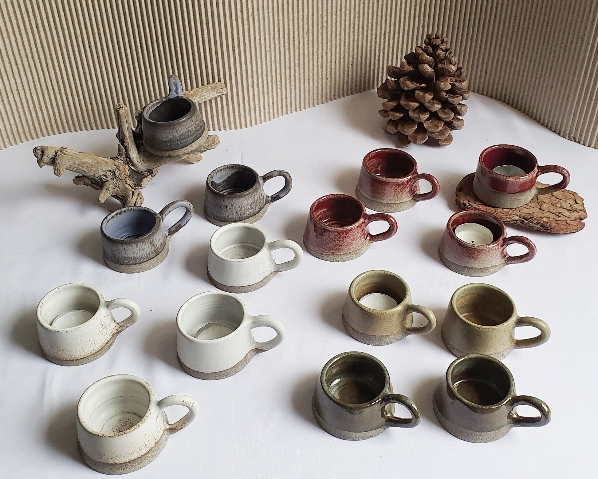 Porta candeline BUGIA in gres grigio con manico, smaltate in bianco, linea Origine . Hanno dimensioni di 7cm di base x 4 centimetri di altezza, il foro è di 5,5cm . Ricordano le vecchie bugie porta candele del passato, sono perfette anche per bere il caffè espresso