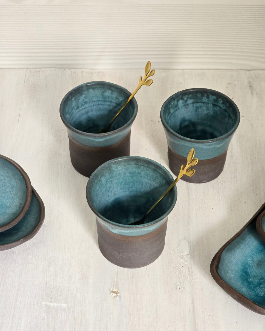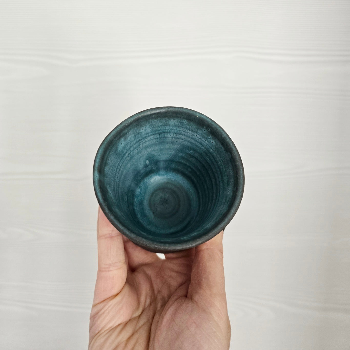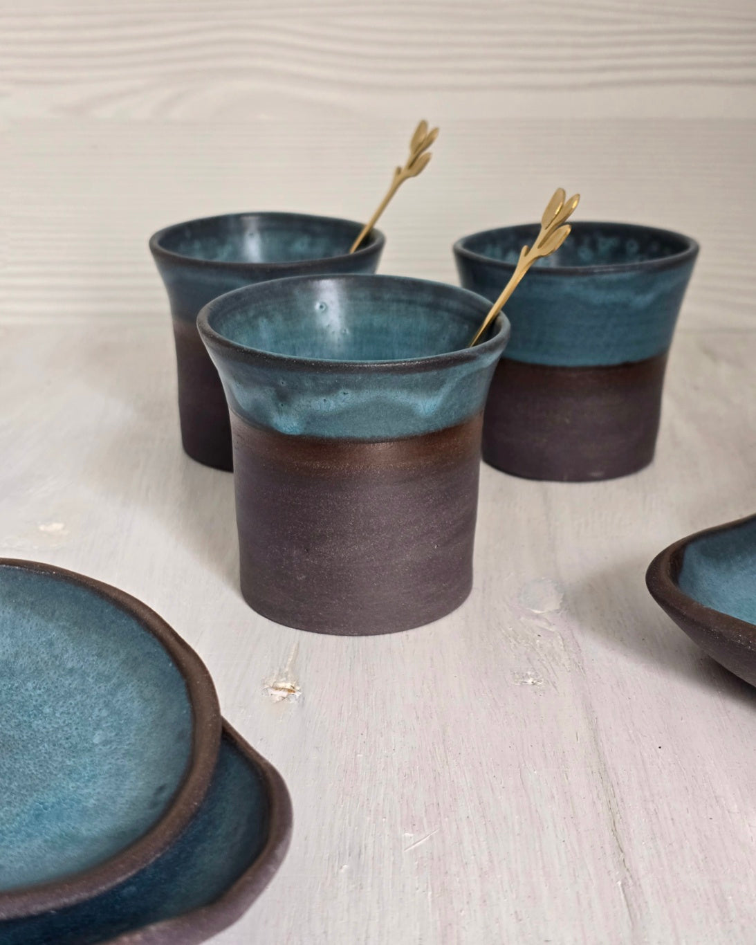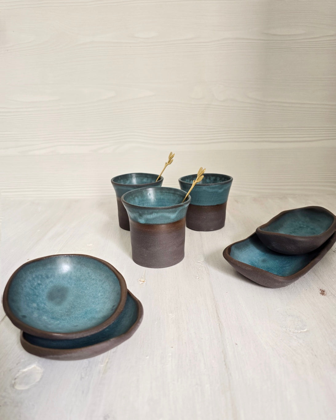 Piccole, essenziali e scenografiche. Le Corolla nascono dal contrasto tra il gres nero materico e la luminosità del turchese interno, che affiora anche sul bordo esterno, proprio come un petalo che si schiude.